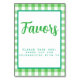 Add a touch of elegance to your gift table with our Bright Green Gingham Favors Sign. Featuring a stylish bright green gingham pattern and the words "Favors" along with " Please take one! Thank You for Celebrating with Us," this tabletop sign is a charming way to guide your guests.