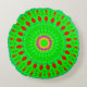 Round throw pillow in colors of bright green and red accents in a bohemian style design.