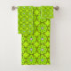 Bright green towels with intricate circular patterns hang on a rod and are displayed folded. The design exudes a vibrant, geometric aesthetic.