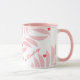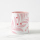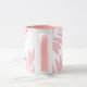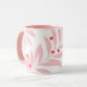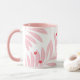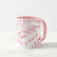 A holiday themed mug featuring a modern foliage background in white, pink and red and personalization for extra special holiday season coffee and cocoa times.