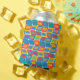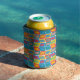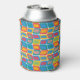 This can cooler has a mid-century modern design of bright colors that make rounded rectangles with other rectangles inside formed by a collection of lines.