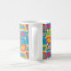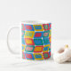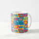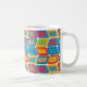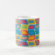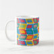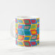 This mug has a mid-century modern design of bright colors that make rounded rectangles with other rectangles inside formed by a collection of lines.