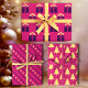Bright magenta pink wrapping paper set, adorned with festive yellow pine trees, modern purple gift silhouettes, and a cheery, minimalist purple and yellow pattern.