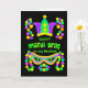 A vibrantly coloured Mardi Gras Greeting Card for a Brother, with a crown, a mask and a string of beads in bright green, purple and yellow on a black background. You can change the inside message if you wish.