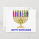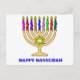 A bright Hannukah menorah with the words Happy Hannukah welcomes the holiday. Happy latke eating!