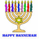 A bright Hannukah menorah with the words Happy Hannukah welcomes the holiday. Happy latke eating!