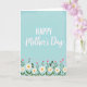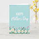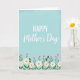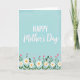 This card features a light aqua background with a soft painted texture, like a calm spring sky, setting a gentle, affectionate mood ❤️. Near the top center, the word “HAPPY” appears in bright white uppercase letters, spaced neatly for a confident look. Directly beneath it, “Mother’s Day” is written in a flowing white cursive style, giving the lettering a tender, hug-like softness. The contrast between the crisp top line and the smooth lower line creates a sweet push-and-pull, like a warm exchange between close family or friends. Along the bottom edge, a garden border of flowers gathers together as if arranged with care, adding a romantic, gift-like touch. White daisies with golden centers mingle with coral and deep pink blossoms, with slim green stems and leaves weaving them into one bouquet 🌼. The flowers sit low across the base, with petals and leaves layered in small clusters against the aqua field.