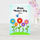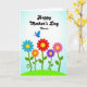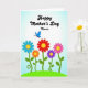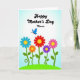 This greeting card features five stylized flowers in bright blue, red, orange, purple, and pink, each with a sunny yellow center that feels like a shared smile ❤️. They rise from a softly rolling green hill, and their curling green stems and small leaves loop upward as if they’re reaching toward someone special. Above them, the sky fades from pale blue to white, giving the scene a light, airy spring-day setting. A small blue winged insect floats over the bouquet, its thin antennae angled forward like it’s leaning in to admire the blooms. Near the top, a large cursive-style message sits prominently in blue, with a smaller line of text tucked just beneath it in a matching shade. The spacing leaves plenty of open sky around the words, keeping the focus on the flowers below 🌼. Decorative stem loops and leaf shapes add gentle motion across the lower half, while the insect hovers slightly right of center against the pale blue-to-white background.