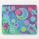 A brightly coloured night sky with shining stars and striped moon. Mouse pad with a purple, pink, blue and green customizable design for you to personalise with your own text, images and ideas. An original coloured pencil drawing by Jess Perry.