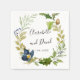 This elegant wedding napkins features your name and wedding date sourronded by a garland of blue flowers and leaves in a airy palette of greens and grays and solid blue.