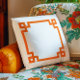 Decorative bright orange Greek key style square border with a modern serif monogram.