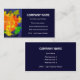 An eye-catching business card with an abstract orange, yellow and green design on a dark blue background, with white lettering. Ready for you to customize with your own details.