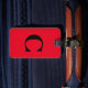 Monogrammed initial and also personal details like name, address, phone number and email all of which you can edit. Designed with attractive solid orange color background, you can change the color if you wish. Cool travel gift idea for him or her.