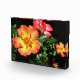Close-up image of bright orange tea roses and a pink rose, against a deep shadow. Captures a moment of extreme natural colors and contrast