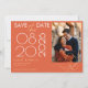 A modern save the date card in trendy bright orange color. This shade of orange is called Verona Sunset. Details in faux gold silhuette of a delicate flower. Modern big typography making date of wedding stand out.