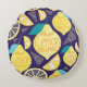 Bright pattern of lemons and cloves on a dark blue round pillow