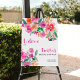 Bright hot pink floral script bridal shower welcome sign featuring pretty hand painted bold pink, orange red blooms flowers and greenery. Perfect for fall boho themed bridal shower garden party. With a modern script typography.