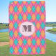 This custom ladies personalized golf towel features vivid orange, aqua, and pink argyle with a customizable monogram on a pink background. It's a stylish, cute gift for a golfer. It's a useful present for your mom, sister, grandma, or any lady whose hobby is playing golf. Women monogram golf towels.