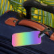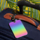 A bright rainbow design is featured on this luggage tag.