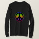 A funky bright rainbow background with a black peace symbol.