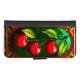 Handcrafted stained glass panel showcasing vivid red cherries and detailed green leaves, surrounded by an ornamental yellow and red floral border. A captivating decorative art piece brightening any window.