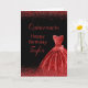 A beautiful bright red themed elegant watercolor dress gown on a black background with faux glitter at the top and bottom of the card.
