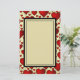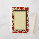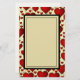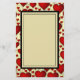 A pattern of bright red romantic hearts, some big some small on a yellow background. Subtle black lines between the hearts give it an interesting looking texture. The center has a black bordered tan colored overlay for easy writing.