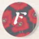 Painting of bright red tulips on a black background, with a placeholder for an initial, printed on beverage coasters.