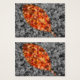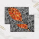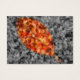 A selectively colored autumn photograph of fallen crepe myrtle leaves, with a gold-framed leaf shape of bright red, orange, and yellow against a black and white background.