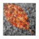 A selectively colored autumn photograph of fallen crepe myrtle leaves, with a gold-framed leaf shape of bright red, orange, and yellow against a black and white background.