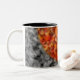 A selectively colored autumn photograph of fallen crepe myrtle leaves, with a gold-framed leaf shape of bright red, orange, and yellow against a black and white background.