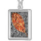 A selectively colored autumn photograph of fallen crepe myrtle leaves, with a gold-framed leaf shape of bright red, orange, and yellow against a black and white background.