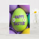Designed with a close-up focus on a single egg-shaped decoration, the scene centers on a smooth lime-green surface that draws your eye right away 🐰. Raised purple letters sit across the front, spelling out a seasonal greeting in a tidy line that feels like it’s being offered to someone special. Two small white flowers with sunny yellow centers rest near the lettering, like little accents placed with care for a close friend. Behind it, the background softens into a gentle blur of other egg shapes in lavender, pale yellow, and cool teal, suggesting a shared table or a small gathering. Shredded purple paper fills the bottom of the frame, adding texture like a nest that’s been arranged for a thoughtful exchange 🌷. Soft, diffused light glides over the curved surface, giving the colors a calm glow and a tender, inviting mood. The purple letters stand out clearly against the green, while the white petals and yellow centers add tiny points of contrast. In the distance, the pastel eggs fade into creamy shapes above the purple paper base.