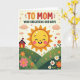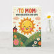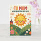 Designed with an expressive, human-like sun at the center, the illustration shows a large yellow face with one eye winking, a wide smile, and rosy cheeks that feel like a loving wink to mom ❤️. The background stays light and airy, letting the sunny character glow as the main focus. Below, rolling green hills stretch across the scene in several soft shades, creating a calm outdoor setting. Clusters of simple flowers dot the foreground and mid-ground in pink, orange, and white, like a garden arranged with care 🌼. On a distant hill to the left sits a small red house with a tiny flag on the roof, adding a cozy, lived-in touch. Across the upper sky, the message “TO MOM WHO BRIGHTENS OUR DAYS” appears in large uppercase letters with a warm gradient, centered near the top. Small heart shapes and little starburst sparkles are scattered around the sun, as if the sky is quietly cheering her on. The hearts float lightly across the pale sky while the starbursts twinkle near the sun’s rays.