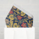 This design features a fabric pattern created by British artist William Morris (1834–1896), who was a founder of the Arts and Crafts movement. It shows green foliage on a blue background with red and pink touches of colour. There are visible sunflower, violet and columbine flowers. The original pattern was first designed in 1883.