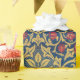 This design features a fabric pattern created by British artist William Morris (1834–1896), who was a founder of the Arts and Crafts movement. It shows green foliage on a blue background with red and pink touches of colour. There are visible sunflower, violet and columbine flowers. The original pattern was first designed in 1883.