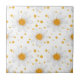 A cheerful floral pattern ceramic tile featuring white daisy-like flowers with bold yellow centers, playfully scattered across a crisp white background. Small yellow dots are sprinkled throughout, adding a charming and sunny accent. Ideal for spring and summer designs, floral art lovers, and anyone drawn to fresh, happy, nature-inspired motifs.