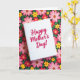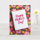 This greeting card sits on a slight diagonal, its bright white front standing out against a dark floral background. Centered on the card, the words “Happy Mother’s Day!” appear in fuchsia lettering with flowing, cursive-style strokes, giving the message a tender, affectionate tone ❤️. Around the card, a dense garden pattern fills the scene, like a bouquet that’s been scattered lovingly across the surface. The blossoms are stylized in soft pink, sunny yellow, and warm red, with fresh green leaves curling between them 🌼. The dark backdrop makes the lighter petals feel closer, as if they’re leaning in toward the card the way family might gather around a loved one. Gentle, even lighting keeps the card face crisp while the surrounding flowers soften slightly into the background. The floral pattern repeats across the black ground with clusters of pink, yellow, and red blooms threaded with green leaves.
