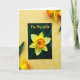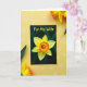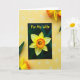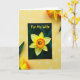 This greeting card sits slightly tilted on a golden-yellow surface, drawing the eye with its deep, dark front that sets off a single spring flower like a spotlight. The bloom has sunny yellow petals and a ruffled, trumpet-shaped center shaded from warm orange to rich gold, giving it a tender, romantic glow ❤️. Near the top of the card, the words “For My Wife” appear in bright yellow, flowing lettering that stands out clearly against the dark background. The yellow surface behind the card is dotted with small white, star-like flower shapes, adding a light, friendly touch 🌼. Around the card, real-looking yellow blossoms with orange-fringed centers peek in from the upper edge and lower corner, as if they’re leaning closer. Dark green leaves frame the scene from the sides, and the gentle lighting smooths the shadows so everything feels soft and close. The final view shows the card centered among the scattered white floral shapes on the yellow backdrop, with petals and leaves edging in from the top and bottom.