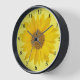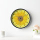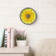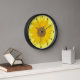 A close-up photo of a bright yellow sunflower on light yellow background with black numbers.