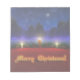 A 3D Christmas scene created in Vue, with candles set on red in front of pine garland accented with red and gold ornaments. In the snowy background are blue-green fir trees against a swirling fractal sky sprinkled with stars. A single sparkling star dominates the night sky. In front of the holiday decorations is a glowing gold Merry Christmas greeting.