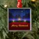 A 3D Christmas scene created in Vue, with candles set on red in front of pine garland accented with red and gold ornaments. In the snowy background are blue-green fir trees against a swirling fractal sky sprinkled with stars. A single sparkling star dominates the night sky. In front of the holiday decorations is a glowing gold Merry Christmas greeting.