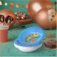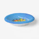 This paper bowl has a cute smiling lizard done in bright colours of yellow, green, blue, and orange holding a twig with a green leaf on deep blue background. Customise the Happy Birthday text with the templates.
