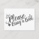 Bring a book instead of a card...Include this insert with your invitation. This trendy Bring a Book card features a white background and black script with flourishes on the front and your text on the back. Fill in your information on the template. Use the customize feature to change the fonts and/or layout and choose a background color.
