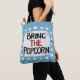 "Bring The Popcorn" is a cute text design in light blue with black and red text, along with a white accent shape and white textured whimsical dots surrounding it.