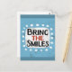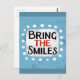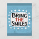 "Bring The Smiles" is a cute text design in blue with black and red text, along with a white accent shape and white textured whimsical dots surrounding it.
