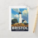 A charming, vintage-style travel poster featuring a classic white lighthouse standing tall on a rocky coastal setting, representing Bristol, Rhode Island. With dramatic clouds and a bright blue sky, this design captures the nautical charm of New England. Perfect for maritime enthusiasts, locals, and collectors of retro coastal travel art.