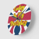 The Union Jack pattern provides a strong and recognizable visual context, enhancing the celebratory nature of the piece.
