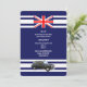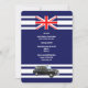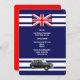 A fun, unique and patriotic British pride theme featuring a dark blue background on which horizontal white stripes hug the top and bottom edge. The top one has a Union Jack flag on it and the bottom one a black London taxi. The back is red and additional details may be added there.