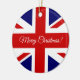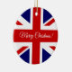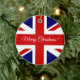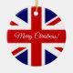 Personalized British Union Jack flag Christmas tree ornament. Custom Merry X-mas Holiday decorations in round or heart shape. UK Flag of United Kingdom GB Great Britain design. Patriotic english pride xmas decor for friends, family, kids, co worker, employee, boss, children, wedding couple, newly weds, mom and dad, grandparents, relatives, baby etc. Add your own season's greeting and photo on the back optionally. Elegant script typography template. Gold glittery string included. Create your own keepsake for 1st Christmas together or other occasion.